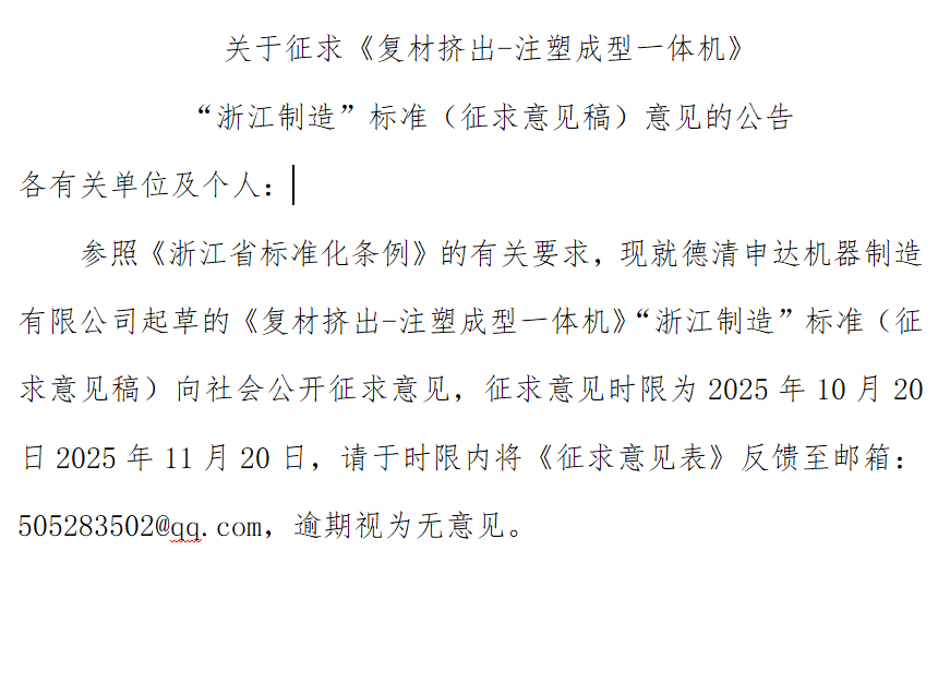 關(guān)于征求《復(fù)材擠出-注塑成型一體機》 “浙江制造”標準(征求意見稿)意見的公告